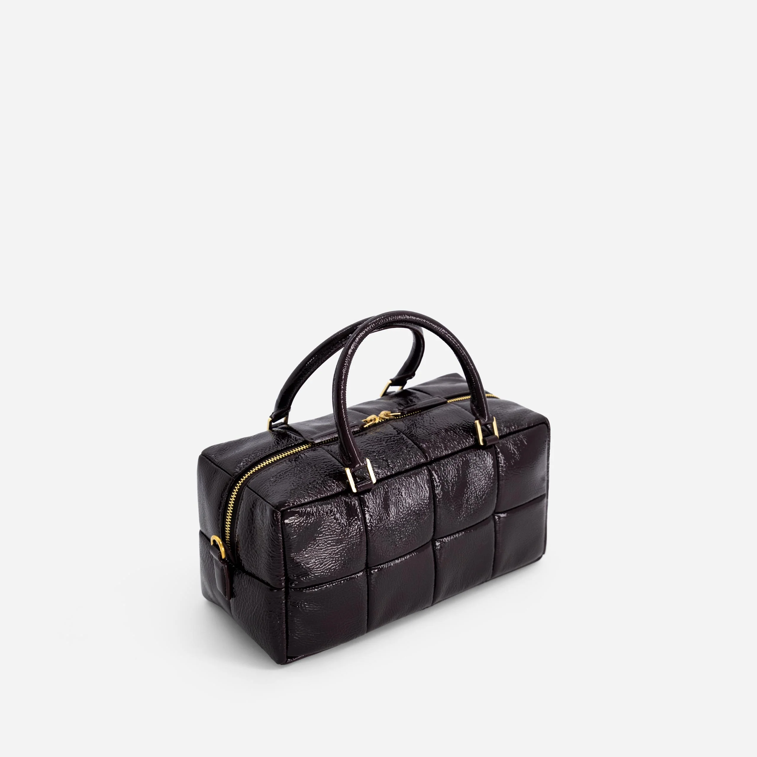 A study in soft structure - crafted from padded leather squares, each stitched and sculpted to form a bold, graphic surface. Grid reimagines the bowling bag with a sleek rectangular silhouette, balancing sharp lines with a pillowy feel.