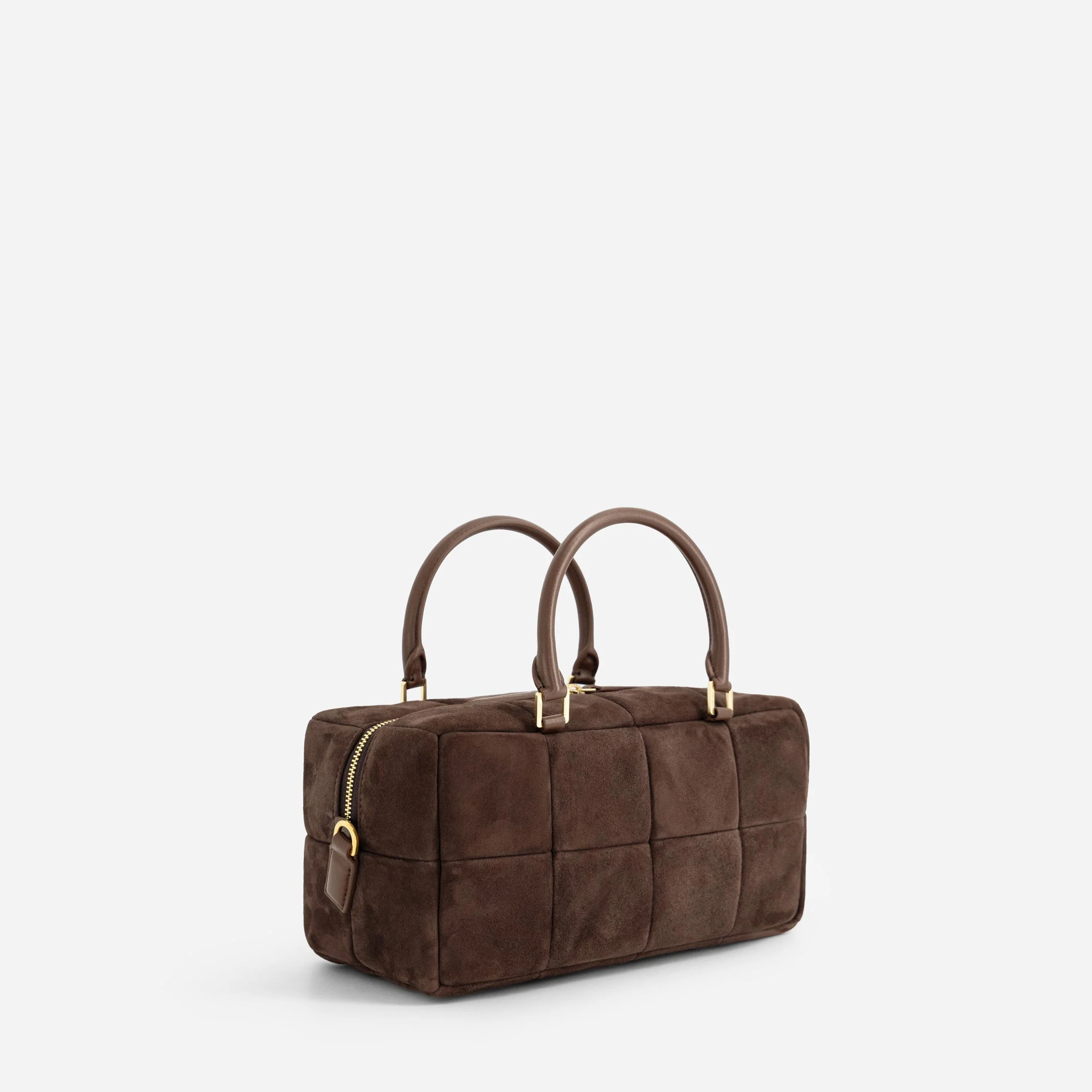 A study in soft structure - crafted from padded leather squares, each stitched and sculpted to form a bold, graphic surface. Grid reimagines the bowling bag with a sleek rectangular silhouette, balancing sharp lines with a pillowy feel.