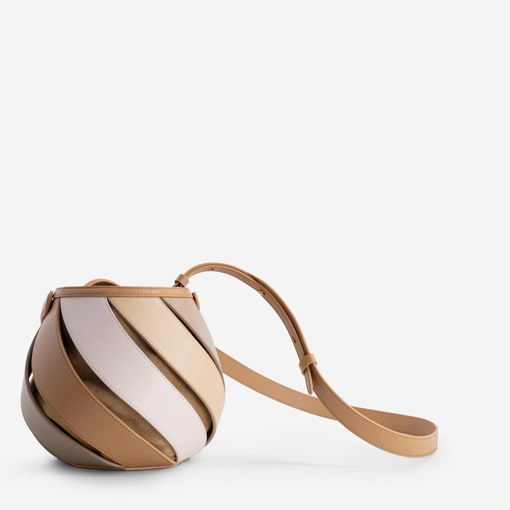 The Helix Bag features a unique wind spinner silhouette. Crafted from smooth leather, it boasts a cleverly designed top handle linked through a hidden joint, allowing it to elegantly fall when using the shoulder strap. A luxurious suede drawstring top ensures your belongings are kept safe and stylishly stowed.